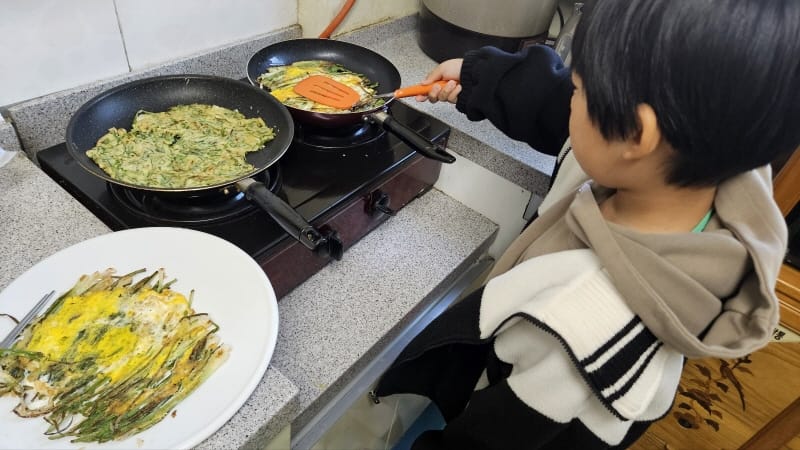 직접 수확한 파를 요리해서 먹는 모습이다.