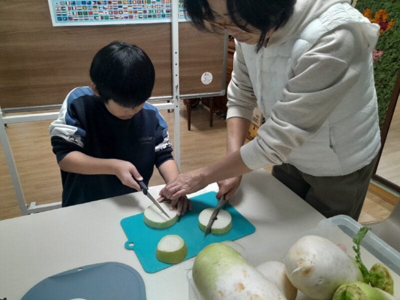 수확한 무로 깍두기를 담그는 모습이다.