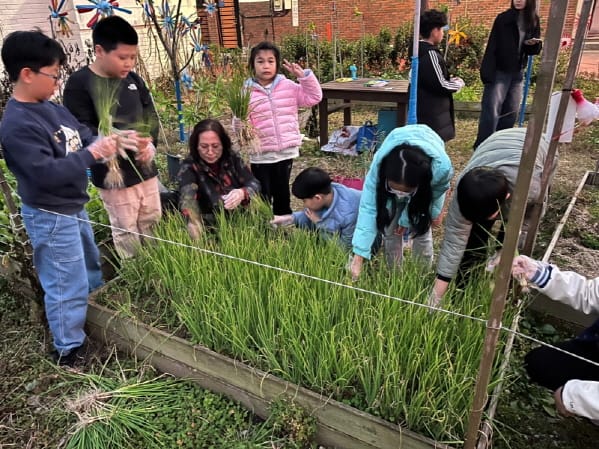 11월 21일, 아동들이 직접 심은 파를 수확하는 모습이다.