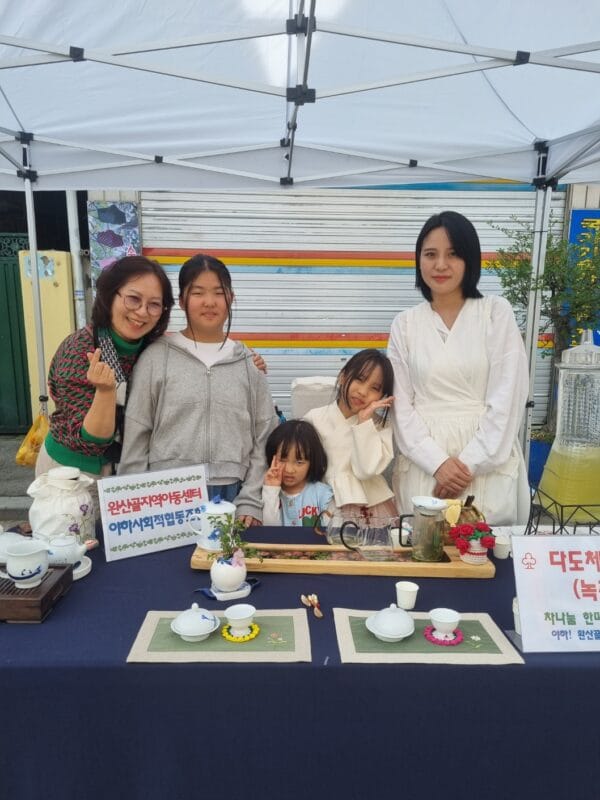 2026년 4월, 완산골지역아동센터는 ‘완산의 봄마실 플리마켓’ 행사에서 다도체험 및 차나눔 행사로 참여하였다. 이웃 어르신께 직접 녹차를 따라드리는 모습이다. 아동들은 인성다례 프로그램을 통해 배운 것을 바탕으로 직접 차를 우리고 이웃에게 나누는 경험을 하였다 이를 통해 아동들은 이웃에게 따뜻함을 전달하고 나누는 것에 대한 기쁨을 느꼈다. 또한 함께 살아가는 이웃과의 공동체 의식을 느끼는 경험이 되었다.