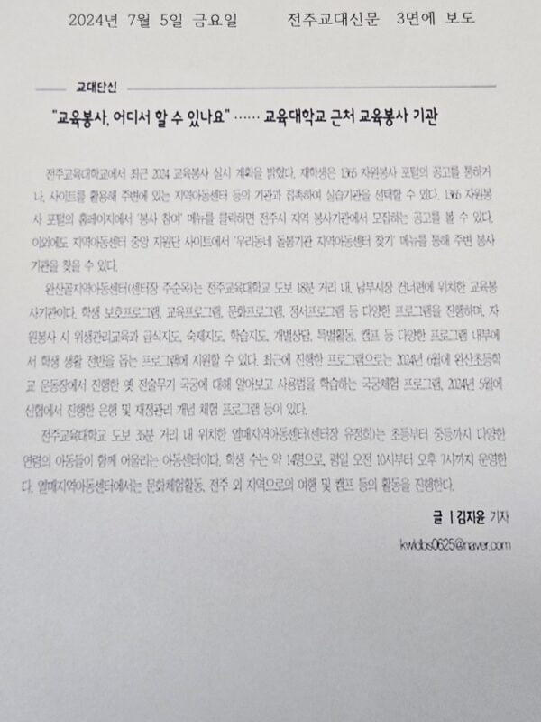 2024년 12월 20일 금요일, 한옥마을 부근의 부에나까사 카페에서 전북초등음악수업연구회에서 주회하는 연말 연주회가 열렸다. 완산골지역아동센터 아동들은 바이올린과 기타 연주를 열심히 준비하여 많은 관객 앞에서 공연을 선보였다. 미리 연주회 자리에 가서 선생님과 함께 연주 리허설을 하는 모습이다. 완산골지역아동센터 공연은 2부에 시작되었으며, 완산골 아이들은 그 동안 연습하였던 실력을 마음껏 뽑내는 시간을 가졌다. ‘수고했어, 올해도’ 라는 타이틀로 진행되었던 2024년 전율 연말 음악회에서는 사물놀이, 핑거스타일 기타연주, 성악, 댄스, 우쿠렐레 등 다양한 악기와 장르의 음악 공연이 진행되었다.